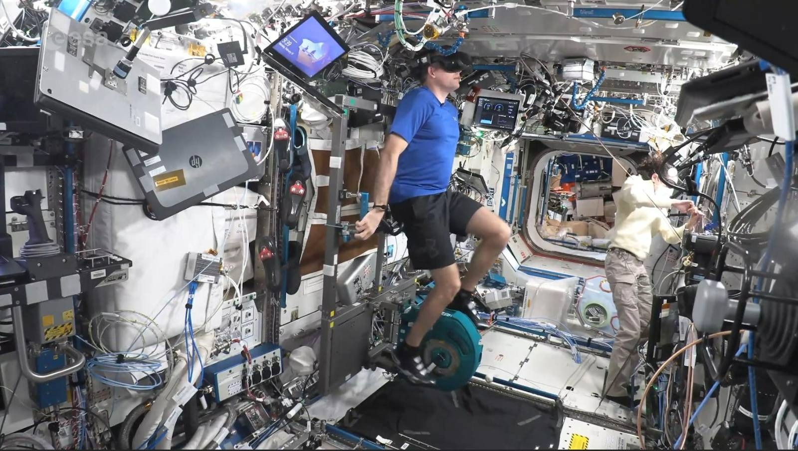 Andreas Mogensen direkte fra ISS den 27. februar 2024, hvor han deler sine erfaringer fra VR-forsøget på Huginn missionen (se ESA’s video HER). SYNCSENSE ApS har bidraget til den del af VR-forsøget, som handler om, hvordan VR kan understøtte og motivere til cykeltræning (Billede: ESA/NASA).
