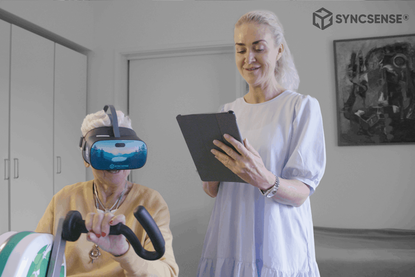 SYNCSENSE® anvendes af neurologiske og geriatriske borgere med nedsat kognitiv funktion og/eller lavt fysisk aktivitetsniveau. SYNCSENSE® er en 2-i-1 løsning, som både kan bruges af dem som mangler motivation til træning – og til dem som mangler kognitiv stimulation.